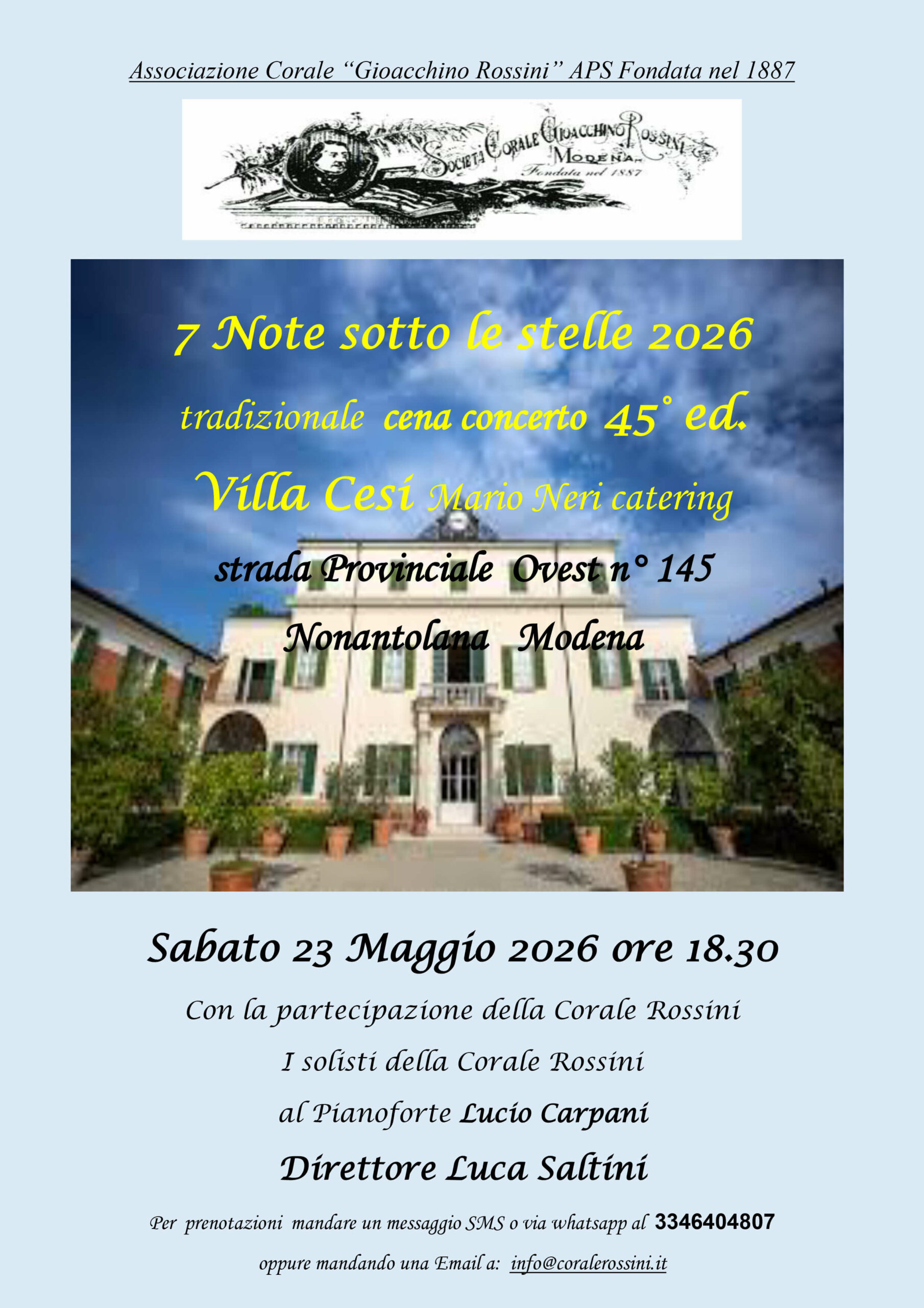L’Associazione Corale G.Rossini per festeggiare la sua stagione concertistica , è solita incontrare convivialmente soci, estimatori e sostenitori ad una grandiosa kermesse canora organizzando una Cena-Concerto denominata “7 Note Sotto le Stelle” che quest’anno ha raggiunto la XXXXV edizione e sarà tenuta il giorno 23/05/2026 presso la prestigiosa residenza di Villa Cesi-Via Provinciale ovest 145, Nonantola( MO ).