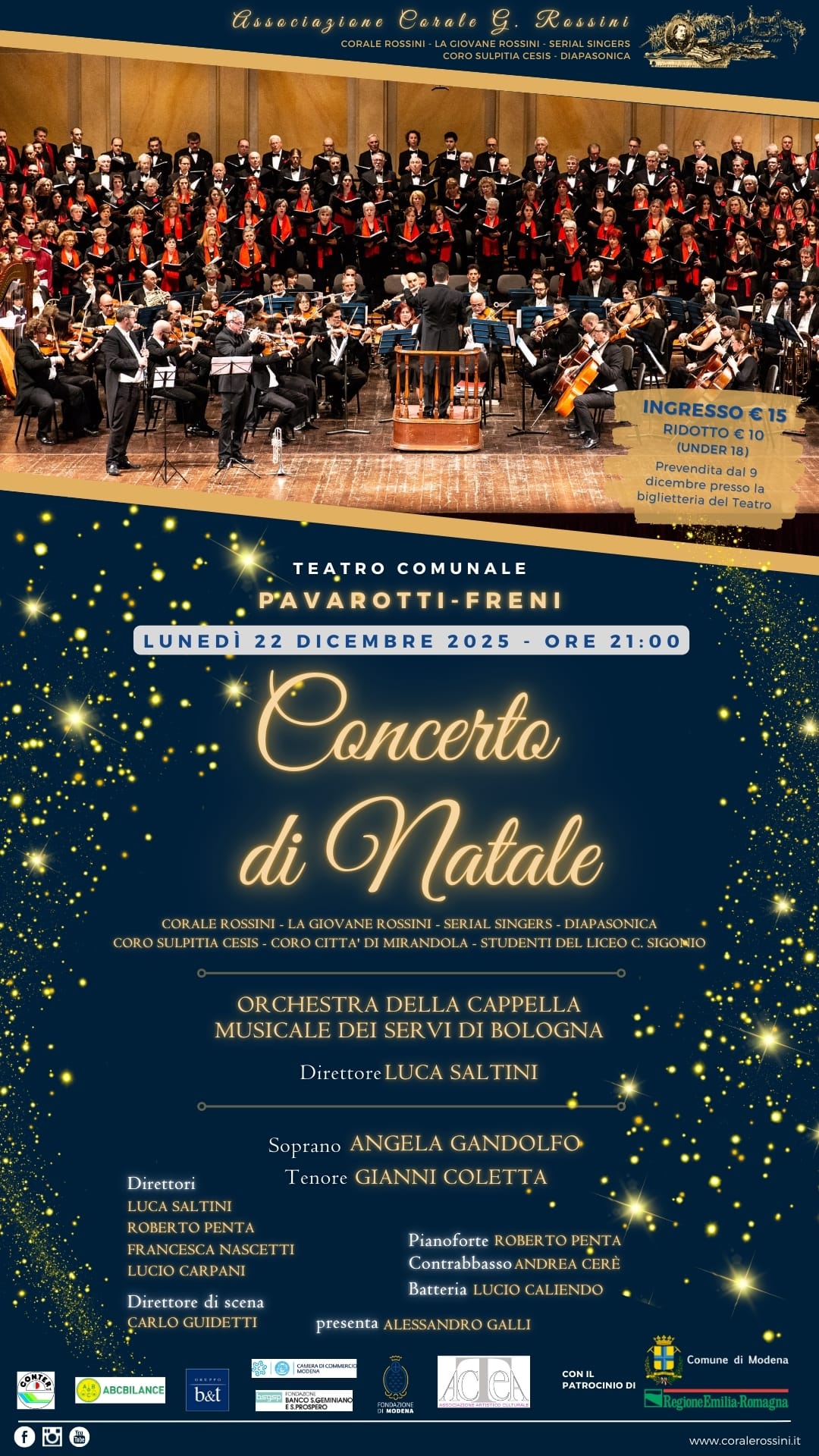 Cosa sarebbe il natale modenese senza il Concerto degli auguri dell’Associazione Corale G.Rossini? Ebbene anche quest’anno la Rossini, propone ed organizza il tanto atteso Concerto degli Auguri di Natale che avrà come location prestigiosa il Teatro Comunale cittadino Pavarotti-Freni il 22 dicembre alle ore 21.00. Il Concerto è l’occasione per far esibire tutti i Cori facenti parte l’Associazione con i rispettivi direttori e cioè la Corale G.Rossini, la Giovane Rossini, i Serial Singers, I Diapasonica e le Sulpitie Cesis ai quali si unirà un gruppo di studenti del Liceo Musicale Carlo Sigonio. Sarà proposto un programma musicale ricco di brani famosi e accattivanti della lirica, del gospel e spiritual, pop moderna e musica da film, una variegata offerta musicale che catturerà l’attenzione del pubblico ed emozionerà gli appassionati della musica e la cittadinanza tutta. Il cast artistico sarà completato dalla soprano Angela Gandolfi e dal tenore Gianni Coletta, cantanti solisti provenienti dalla scuderia dell’Associazione Artistica ACTEA, dalla prestigiosa Orchestra della Cappella Musicale S.Maria dei Servi e dal Coro Città di Mirandola, oltre ad un complesso strumentale composto Andrea Cerè e Lucio Caliendo.