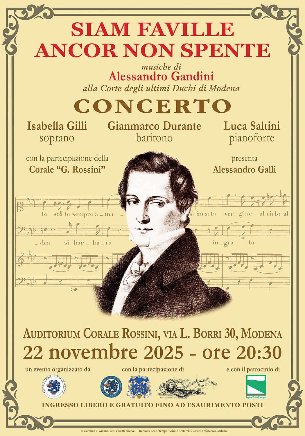 La sera del 22 novembre 2025 alle ore 20:30, in occasione del 150° anniversario della morte dell’ultimo Duca di Modena Francesco V, la Fondazione Croce Reale vi invita all’Auditorium della Corale Rossini per assistere alla prima esecuzione moderna di alcune musiche da camera di Alessandro Gandini (1807-1871), massimo compositore modenese dell’Ottocento, nonché ultimo maestro di cappella della Corte estense. Nel corso della serata si esibiranno, accompagnati dal pianista Luca Saltini, i giovani cantanti Isabella Gilli e Gianmarco Durante. Il concerto sarà arricchito dalla partecipazione di alcune coriste della celebre Corale “G. Rossini” di Modena. Presenta la serata Alessandro Galli.